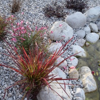 grossi sassi per delineamento bordo laghetto e ciottolo bianco per aiuola